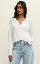 This 100% cotton cardigan was made to layer day to day. Keep things easy with its button front and crewneck style. Wear with a simple rib tank and your favorite denim.