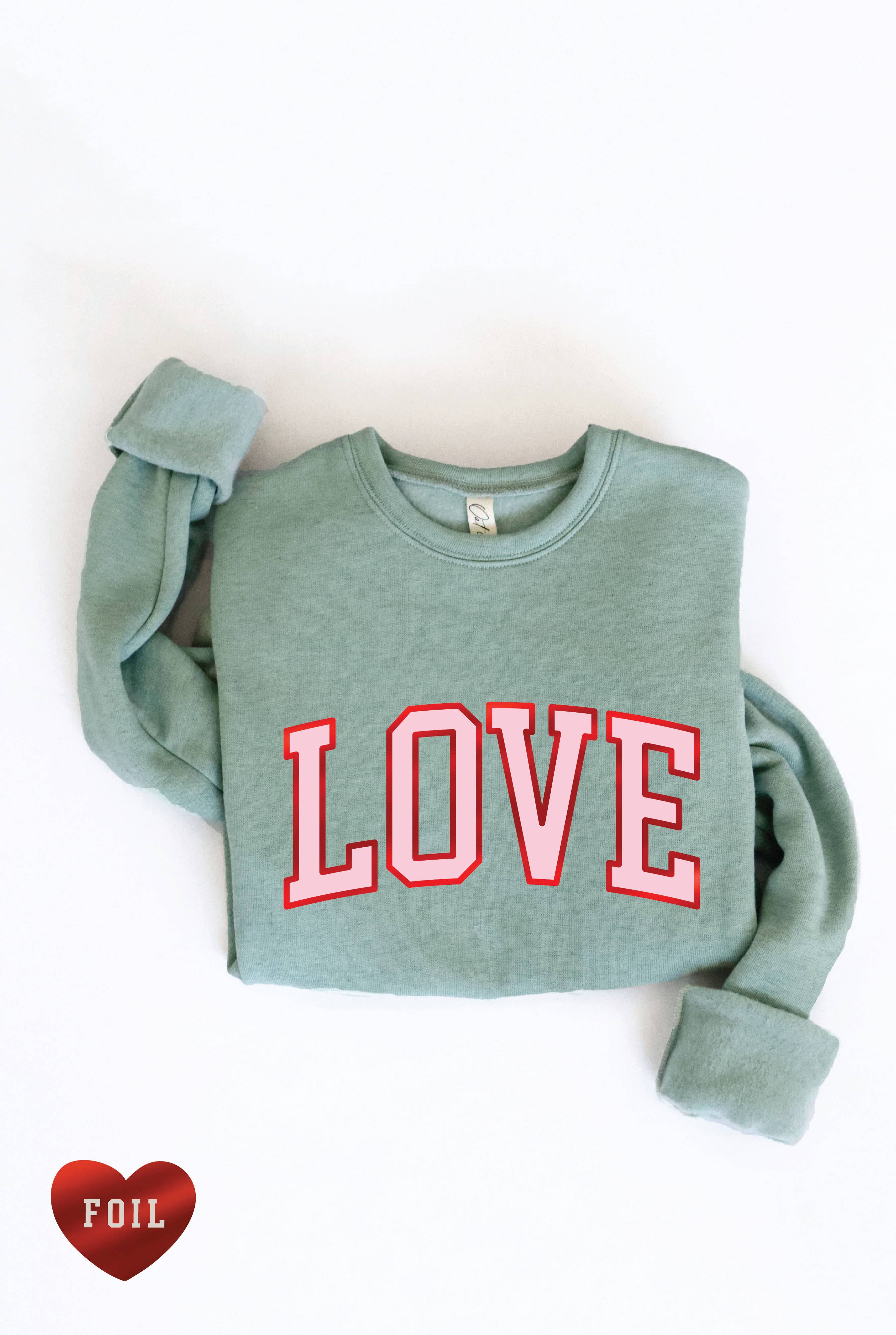 LOVE FOIL Graphic Sweatshirt Unisex Fleece Pullover Relaxed Fit. -Spun from plush sponge fleece fabric -Remarkably soft unisex pullover -Crew neck sweatshirt lends itself to daily wear and year-round layering. -Featuring ribbed cuffs and waistband, a crew neck, and fashion-forward fleece fabrication.