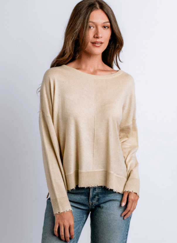 Oversized long sleeve crew neck top with center seam and ripped hem detail