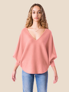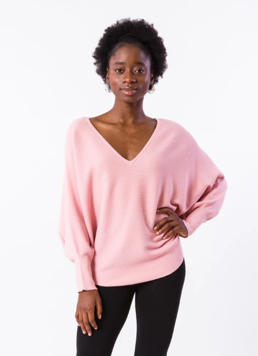 Oversized V-neck top w/ 3/4 length Dolman sleeves and Curved sweep in horizontal Rib pattern.