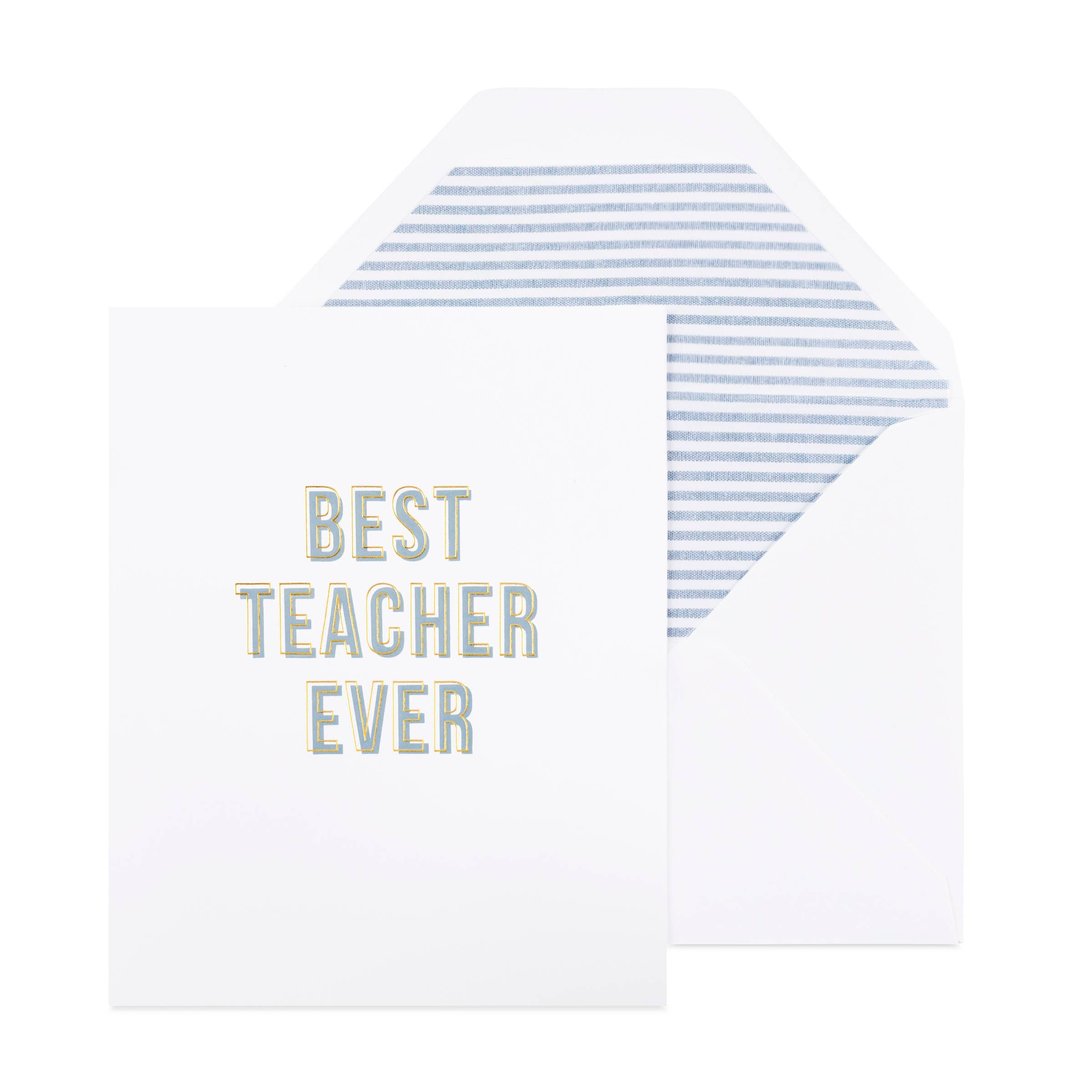 Our graduation card is letterpress printed by hand on antique machinery. Slate blue ink and gold foil on crisp white paper, paired with a white envelope with slate blue stripes. Folded card, blank inside.