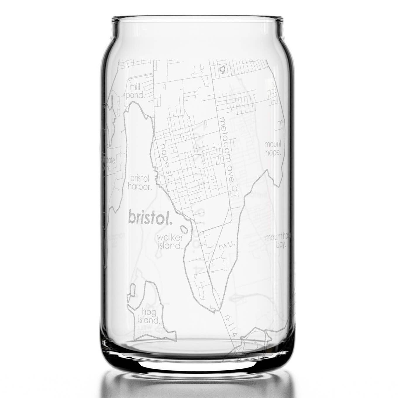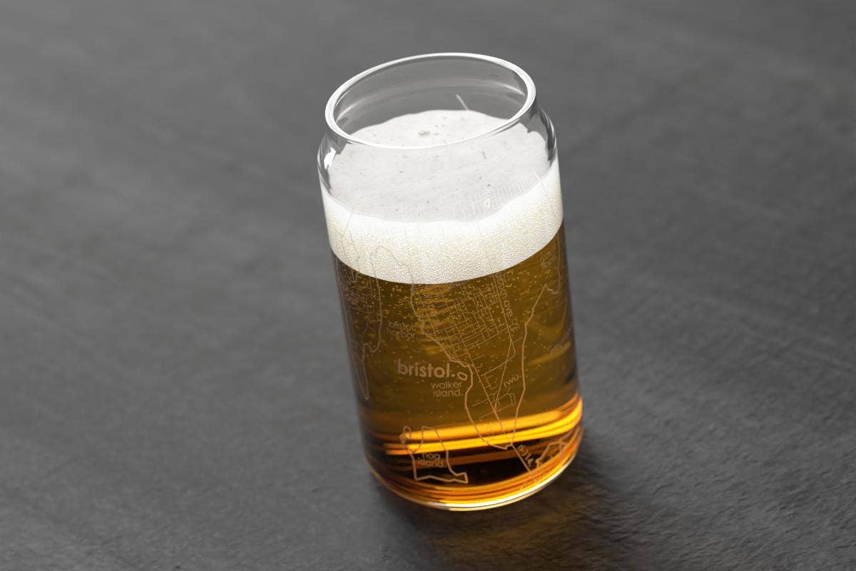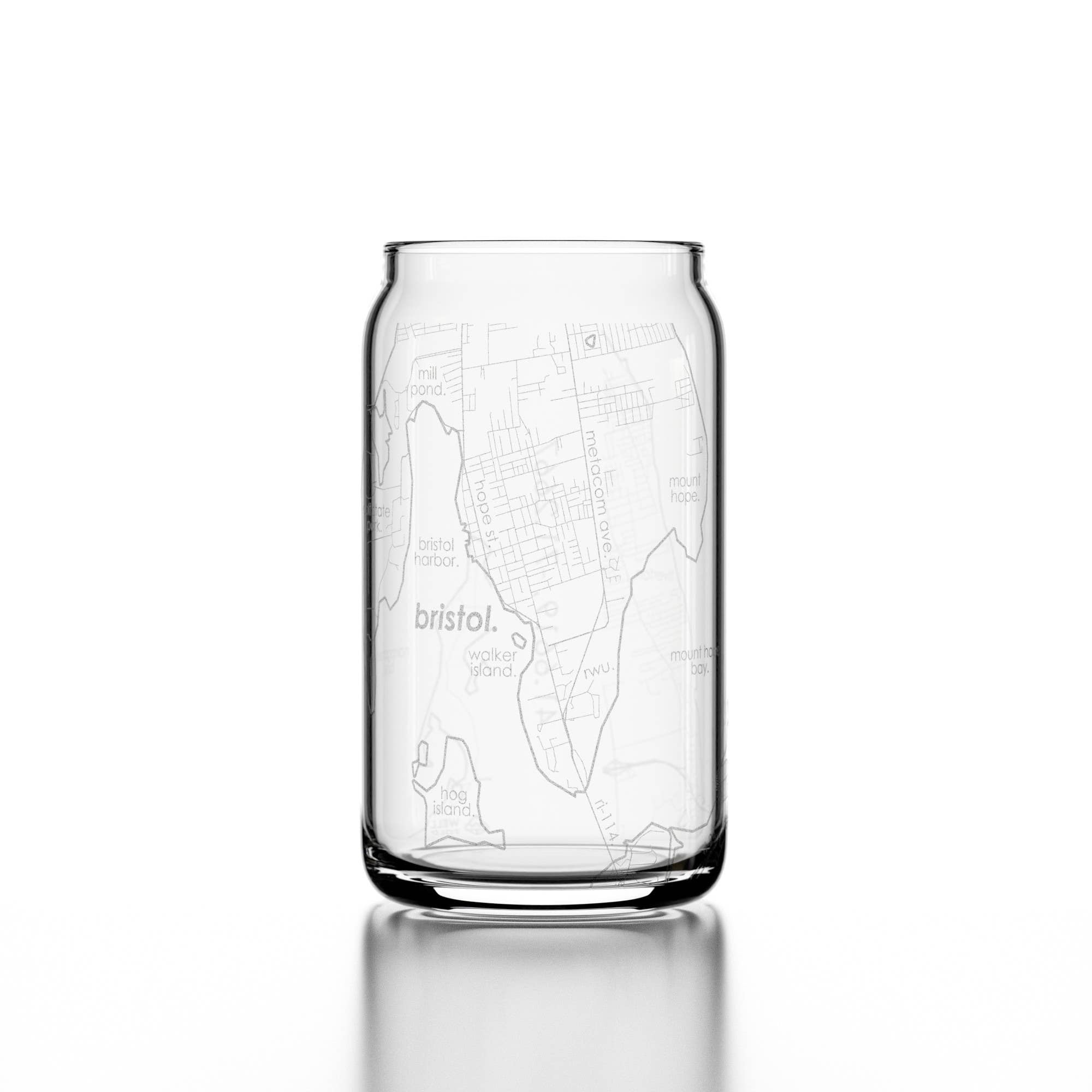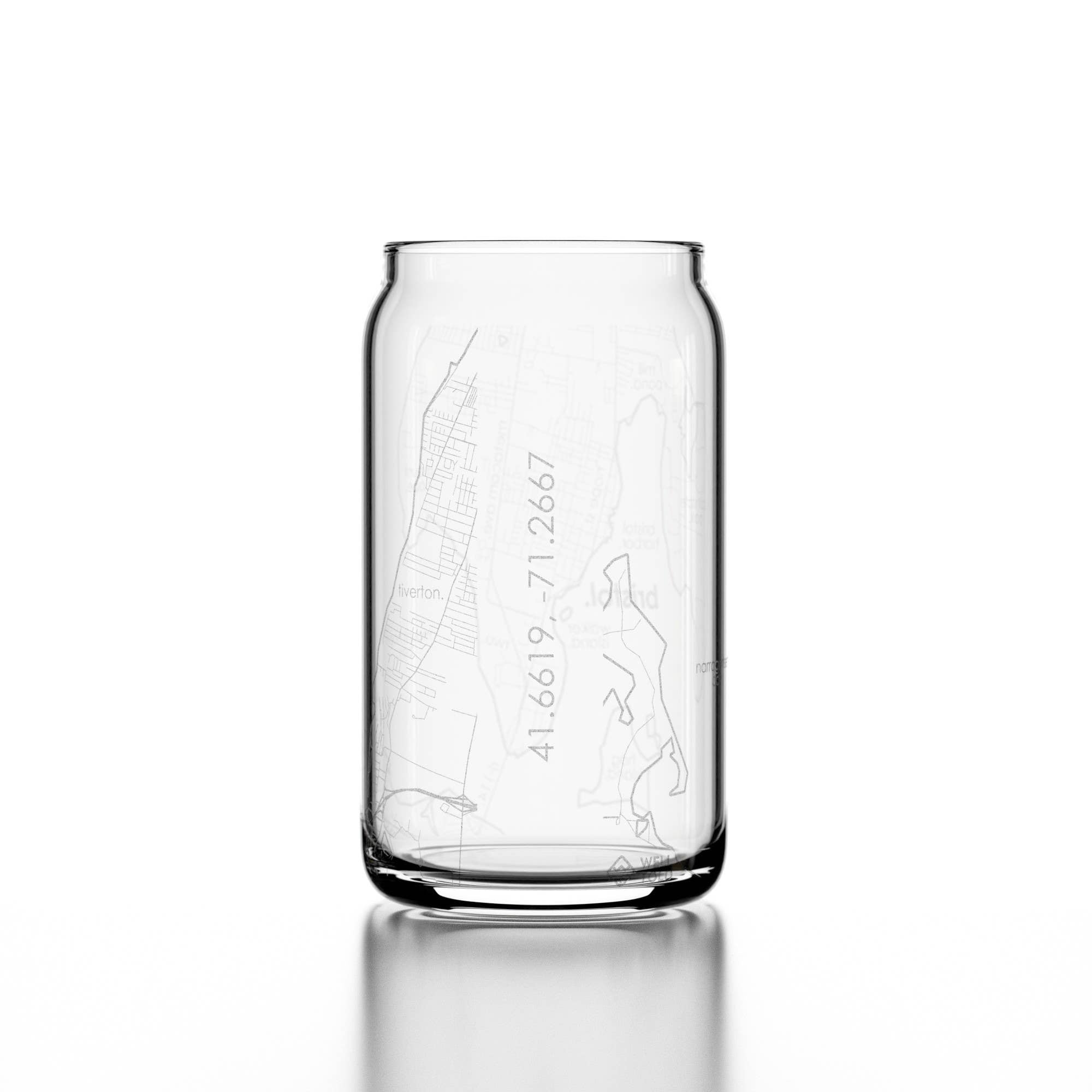 Our modern 16 oz Can Glass can be custom-made with a beautifully engraved map of ANY city or town in the U.S. In the classic profile shape of a beer/soda can it will truly transform your bar top.