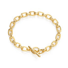 A nice, classic statement bracelet with contemporary appeal. The chunky handmade chain is closed with a trendy toggle clasp. Made of 14k gold plated brass + coated to resist tarnish. Designed and assembled in our Sonoma California studio.