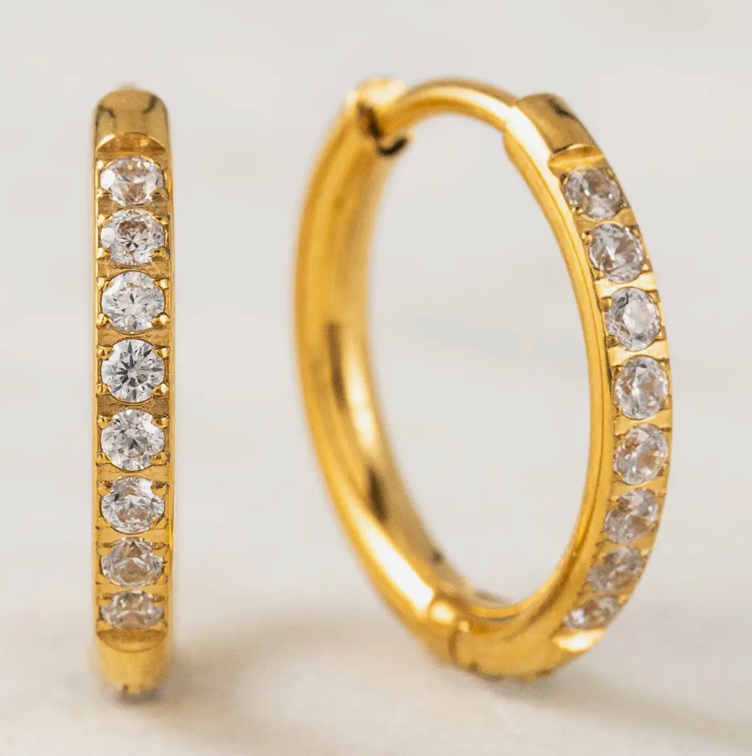 Bring on the bright sparkle with the Evie 15mm Hoop Earrings, designed to deliver light-catching shine in a compact, waterproof silhouette made for daily wear. These are huggie-style hoop earrings crafted from 316L stainless steel and finished with 18K gold PVD, accented with cubic zirconia for added sparkle. Designed for versatile use, they offer a waterproof, tarnish-resistant finish that stays comfortable and polished from morning routines to travel, workouts, and evenings out. Perfect as everyday huggie hoop earrings for customers who want subtle sparkle, secure fit, and low-maintenance jewelry they can wear anywhere. Key Features: * Cubic zirconia detailing for light-catching sparkle * Waterproof, tarnish-resistant, and hypoallergenic * Crafted from 316L stainless steel with 18K gold PVD * Compact 15 mm huggie size with secure closure * Ideal for daily wear, travel, and active lifestyles Construction & Materials: * Made In: China * Materials Used: 316L Stainless Steel, 18K Gold PVD, Cubic Zirconia * Diameter: 0.6" (15 mm) * Finish: Polished gold-tone surface with CZ accents * Care: Waterproof and low maintenance, wipe clean as needed