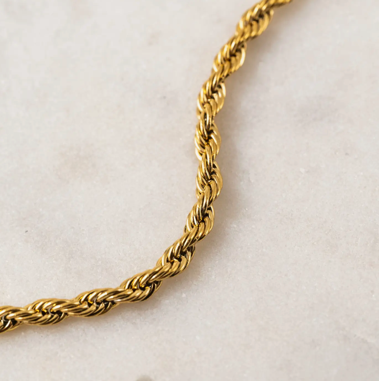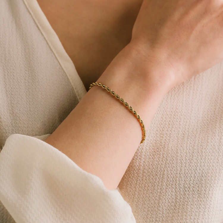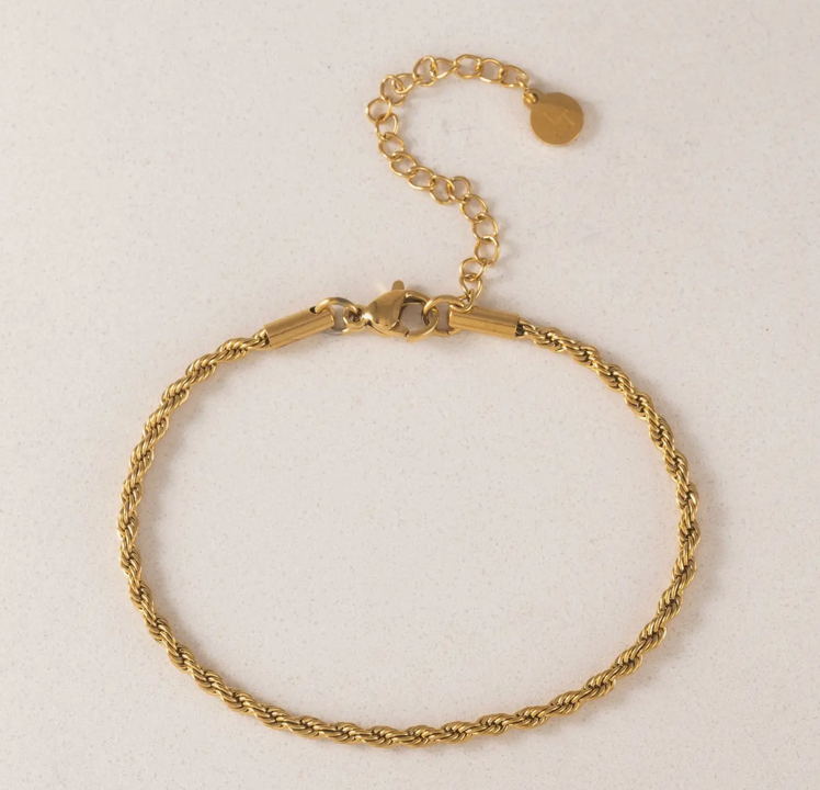 The Gigi Bracelet is a refined twisted chain design that brings subtle movement, shine, and sophistication to your look. This is a link and chain bracelet crafted from 316L stainless steel with a durable 18K gold PVD finish, featuring a delicate twisted profile for added dimension. Created for daily wear, it offers waterproof durability, tarnish resistance, and a lightweight feel that layers seamlessly with other styles. Perfect as a twisted chain bracelet for customers who want a graceful statement piece that feels polished yet easy enough for everyday wear. Key Features: * Twisted chain design for soft texture and visual interest * Waterproof, tarnish-resistant, and hypoallergenic * 316L stainless steel with durable 18K gold PVD coating * Adjustable chain with extender for flexible sizing * Lightweight profile ideal for layering or solo wear Construction & Materials: * Made In: China * Materials Used: 316L Stainless Steel, 18K Gold PVD * Chain Length: 5.7" + 2" Extender * Width: 2 mm * Closure: Lobster clasp * Care: Waterproof and low maintenance, wipe clean after wear
