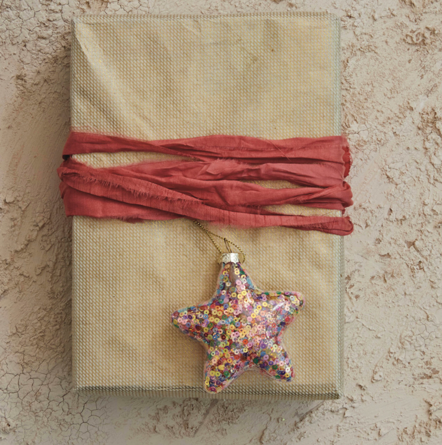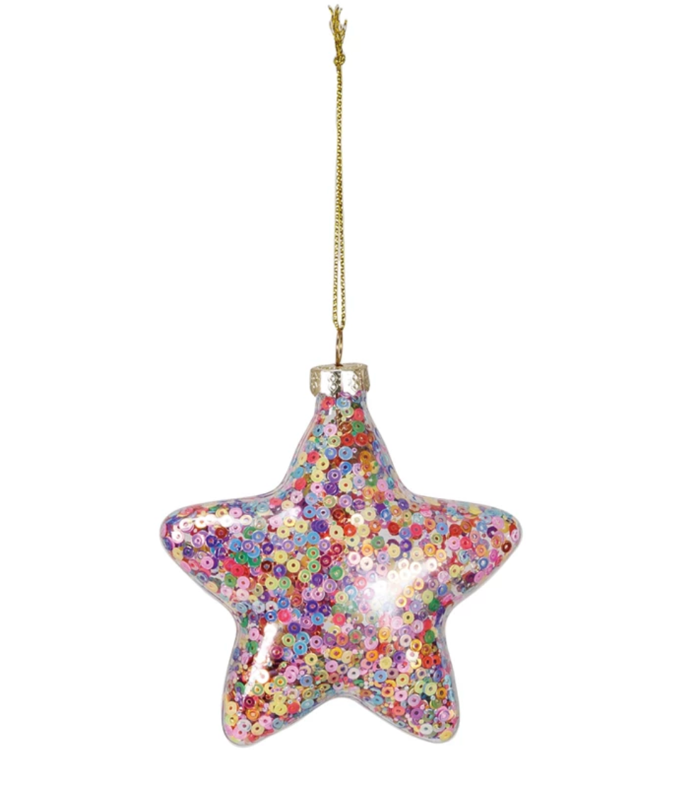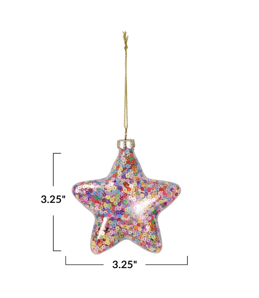 This glass star ornament is a treasure trove of shimmer. Its body, a clear glass canvas, is filled to the brim with sequins that reflect a spectrum of festive hues. It's not just an ornament; it's a beacon of holiday spirit, ready to bring a twinkle to the eye and a glow to the heart of any celebrant. The ornament is 3.25 inches in length and height, ensuring a dazzling display among the holiday decorations. This is a perfect choice for anyone who loves whimsical and adorable holiday decor. A glass star ornament filled with sequins, casting a vibrant dance of multicolor light. An ornament that adds a burst of color and sparkle, perfect for a lively and festive atmosphere. Ideal for prominent display, where it can catch the light and complement the festive cheer.