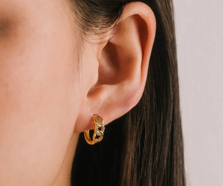 A refined link-inspired silhouette meets bright CZ sparkle, the Kai Hoop Earrings adding a touch of edge while staying polished and easy to wear. The Kai Hoop Earrings are 13.5 mm hoops made from 316L stainless steel with 18K gold PVD and cubic zirconia. Built for daily wear, they are water and tarnish resistant and deliver a modern, textured profile that stands out in an ear stack or solo. Perfect as a wearable statement for trend-forward shoppers who want a subtle twist on classic hoops with practical, low-maintenance construction. Key Features: • 13.5 mm link-style hoops for a dimensional look that frames the face • Cubic zirconia accents deliver crisp sparkle without excess weight • 316L stainless steel core offers durability for frequent wear • 18K gold PVD finish maintains color and shine with minimal care • Water and tarnish resistant for active lifestyles and travel • Hypoallergenic hardware that is gentle on most ears • Smooth hinge closure ensures a secure, comfortable fit Construction & Materials: • Made in China • Materials Used: 316L stainless steel, 18K gold PVD, cubic zirconia • Dimensions: 13.5 mm diameter • Closure: Hinge closure • Care: Rinse and dry after moisture exposure; store separately