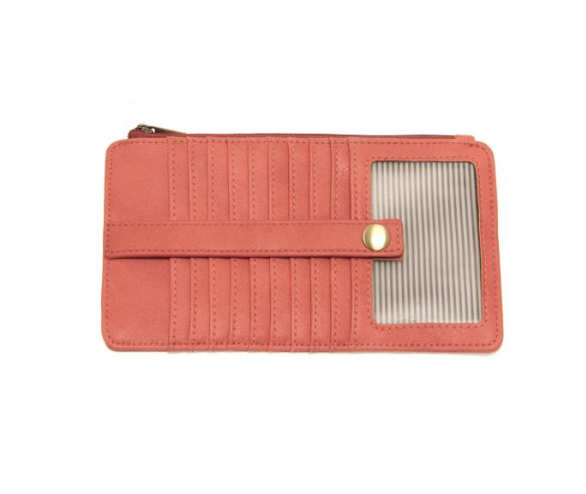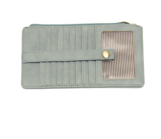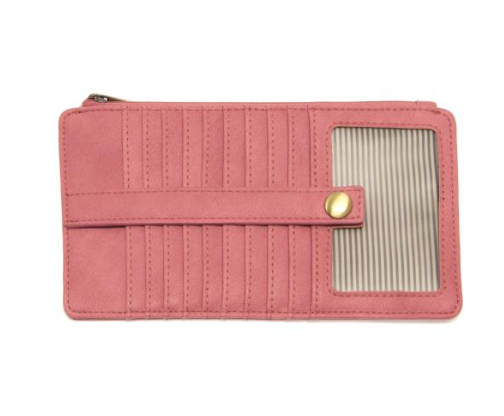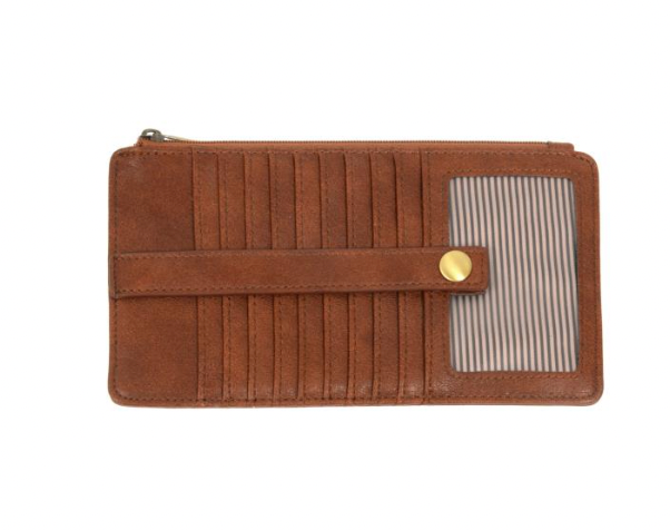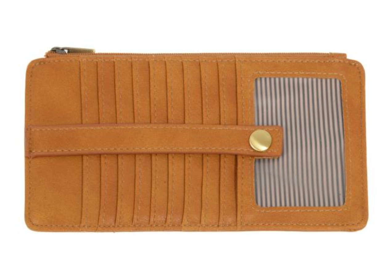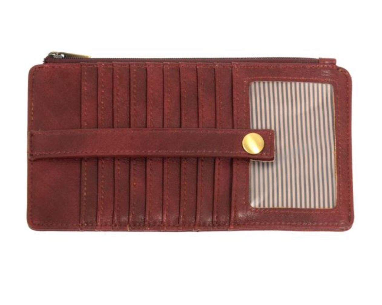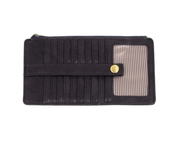 THIS SLIM AND SLEEK CARD WALLET HAS 9 CREDIT CARD POCKETS, AN ID WINDOW, ZIPPERED CHANGE POCKET AND ZIPPERED BILLFOLD POCKET ALL IN CASUAL DISTRESSED VEGAN LEATHER AVAILABLE IN A KALEIDOSCOPE OF BEAUTIFUL COLORS.