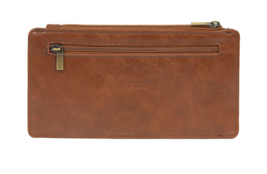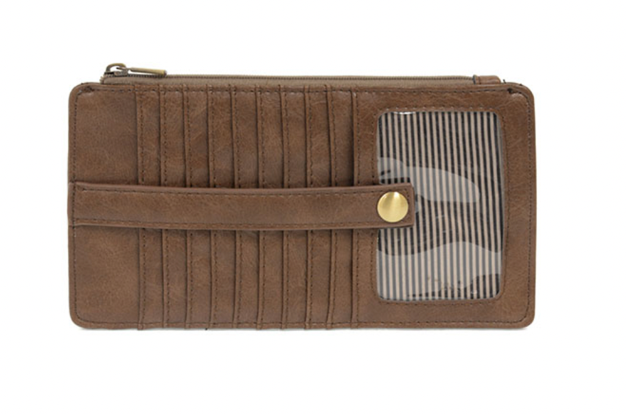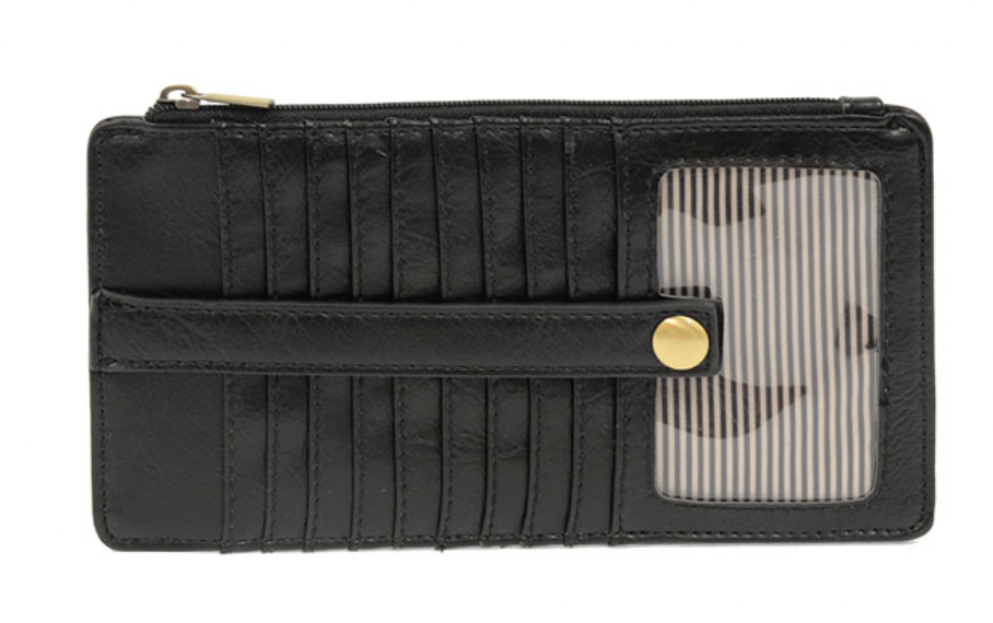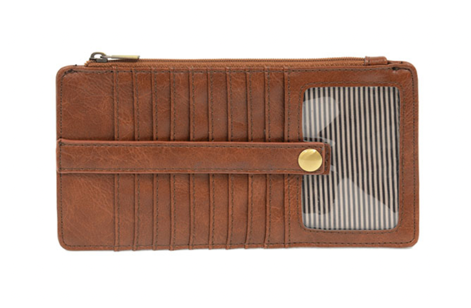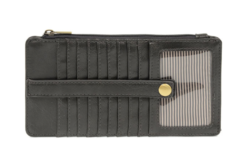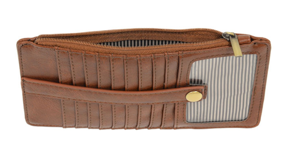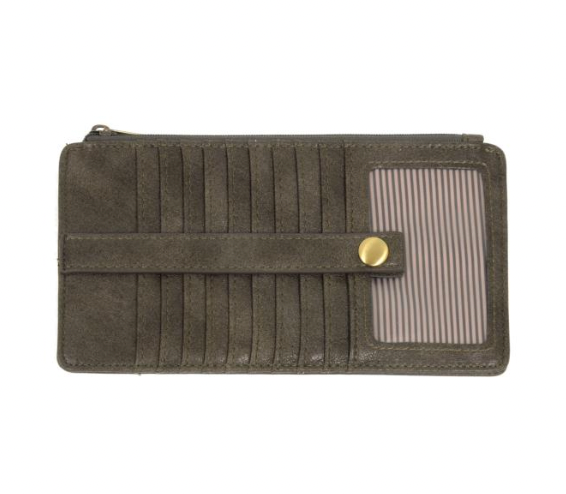 THIS SLIM AND SLEEK CARD WALLET HAS 9 CREDIT CARD POCKETS, AN ID WINDOW, ZIPPERED CHANGE POCKET AND ZIPPERED BILLFOLD POCKET ALL IN CASUAL DISTRESSED VEGAN LEATHER AVAILABLE IN A KALEIDOSCOPE OF BEAUTIFUL COLORS.