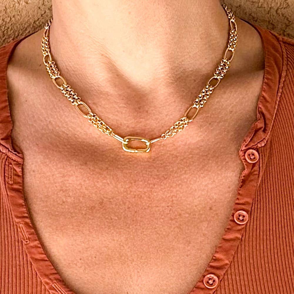 We love these new statement chains here in the studio. They look cool with a pair of jeans but can look sophisticated with a dress. These strong bold lines are reminicient of the 70's sleek modern style. 18" in length, made of 14k gold plated brass and coated to resist tarnish and create a hypoallergenic surface.