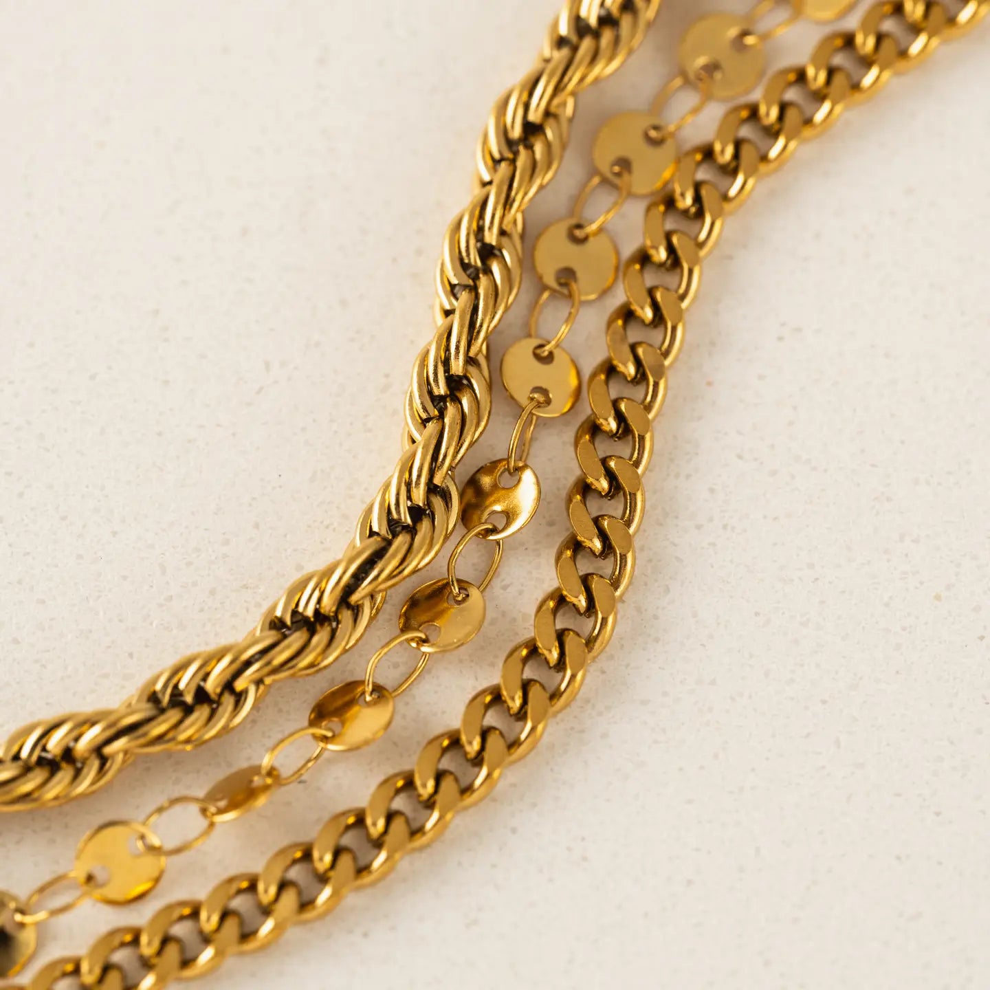 Designed to make everyday styling feel intentional, the Reef Layered Bracelet brings depth and confidence to the wrist with its stacked silhouette that feels bold yet effortless. The Reef Layered Bracelet is a link and chain bracelet crafted from stainless steel and finished with durable 18K gold PVD. Its layered construction creates the look of multiple bracelets in one, offering instant impact while remaining comfortable for daily wear. Perfect as an everyday bracelet for customers who want the visual interest of layered bangles and chain bracelets without the hassle of stacking. Key Features: * Multi-chain layered design for a bold, stacked look * 18K gold PVD coating for long-lasting shine * Lightweight feel despite its dimensional appearance * Adjustable length for a customized fit