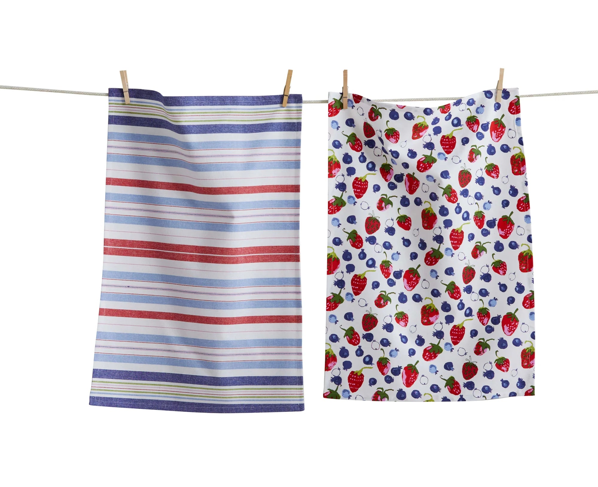 Set of two cotton dishtowels: one hand screen-printed satin weave with strawberries and blueberries, and one yarn-dyed woven stripe.