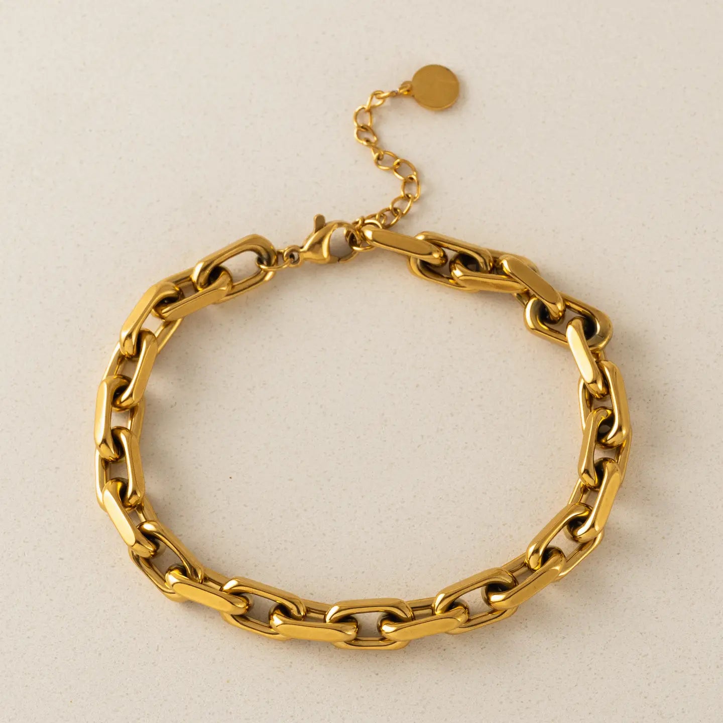 A refined essential that feels instantly familiar, the Veya Chain Bracelet adds a sense of confidence and polish to everyday moments while offering effortless versatility for stacking or solo wear. The Veya Chain Bracelet is a link and chain bracelet crafted from stainless steel and finished with durable 18K gold PVD. Designed for comfortable daily wear, it delivers lasting shine while elevating casual looks and complementing more dressed-up styling. Perfect as an everyday bracelet for customers seeking a timeless gold chain they can wear alone or layer with other bracelets for a personalized stack. Key Features: * Classic link chain design with a polished gold finish * 18K gold PVD coating for enhanced durability and shine * Adjustable length for a customized, comfortable fit * Lightweight feel suitable for all-day wear * Secure lobster clasp closure Construction & Materials: * Made In: China * Materials Used: Stainless Steel, 18K Gold PVD * Length: 6.5 in + 1.25 in extender * Closure: Lobster clasp * Care: Wipe clean with a soft cloth after wear Style Guide: * Colors: Gold *