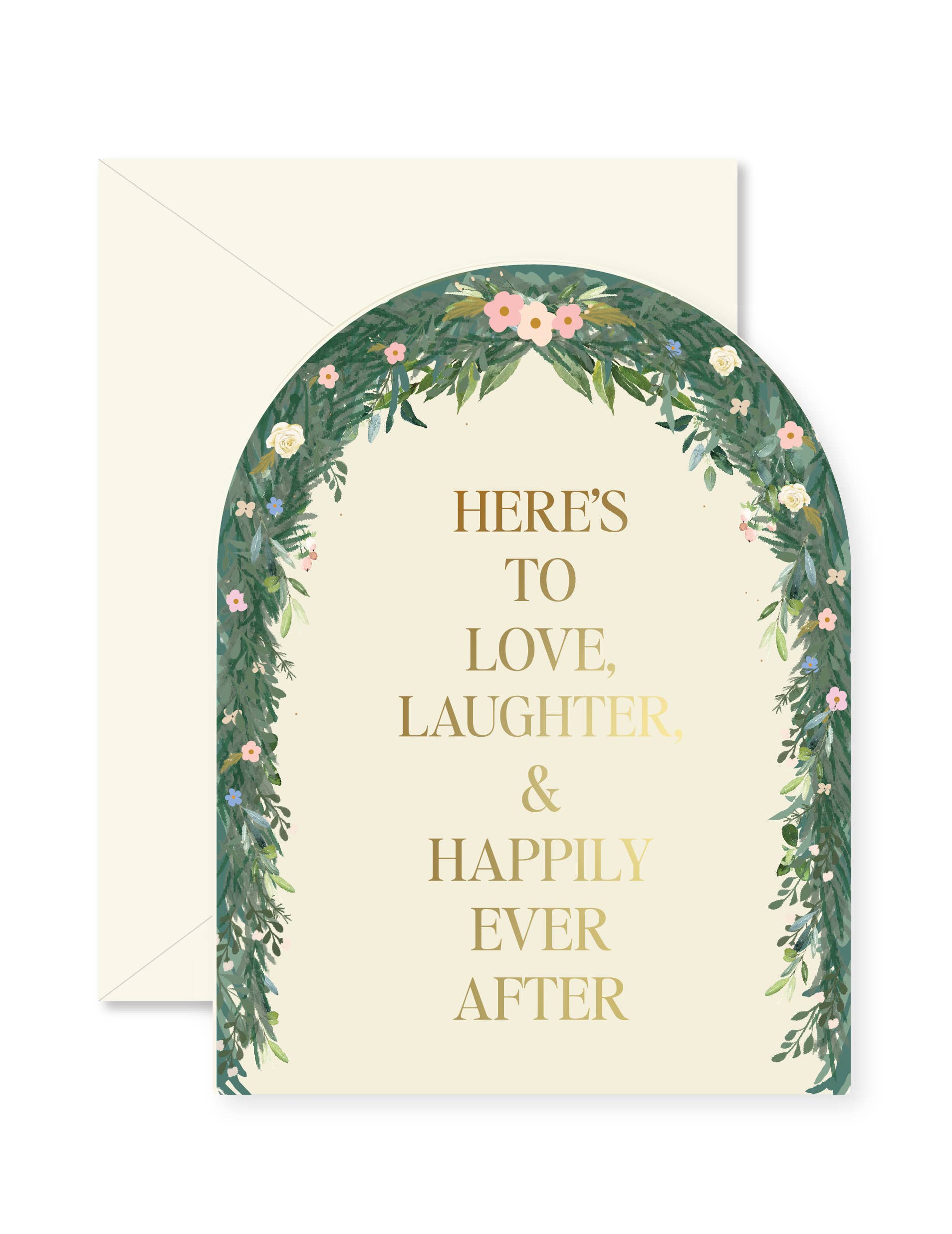 The sweetest floral arch die-cut featuring a gold foil "Love, Laughter, and Happily ever after" message. Full - color 4.25" x 5.5" folded card. Blank interior.